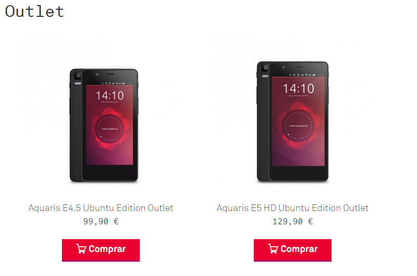 BQ dispone de dos smartphones con Ubuntu Phone: el BQ Aquaris E4.5 y el Aquaris E5 HD. Sus precios de mercado son 169,90€ y 199,90€ respectivamente. Si queremos alguno de ellos a un mejor precio, podemos encontrarlos por 99,90€ y 129,90€ en la tienda outlet.